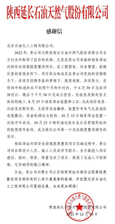 近日,北京石油化工工程有限公司收到來自陜西延長石油天然氣股份有限公司的感謝信,對我公司總承包的楊家灣站內(nèi)部安全距離隱患整改項目在建設(shè)期間精心策劃、合理安排施工、克服不利因素,保質(zhì)保量按期完成了任務(wù)目標(biāo),得到了業(yè)主的肯定。