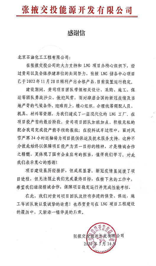 近日,北京石油化工工程有限公司(簡(jiǎn)稱:北油工程)收到張掖交投能源開(kāi)發(fā)有限公司發(fā)來(lái)的感謝信,對(duì)張掖LNG儲(chǔ)備中心項(xiàng)目建設(shè)成果表示了肯定,對(duì)我公司項(xiàng)目團(tuán)隊(duì)表現(xiàn)出的技術(shù)專業(yè)性及不畏艱難、勇于擔(dān)當(dāng)?shù)膱F(tuán)隊(duì)精神表示了感謝。