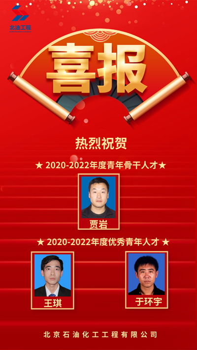 北京石油化工工程有限公司項目執(zhí)行中心副主任、專業(yè)副總工程師賈巖榮獲2020-2022年度青年骨干人才榮譽稱號;電氣室于環(huán)宇、西安分公司油氣儲運室王琪榮獲2020-2022年度優(yōu)秀青年人才榮譽稱號。