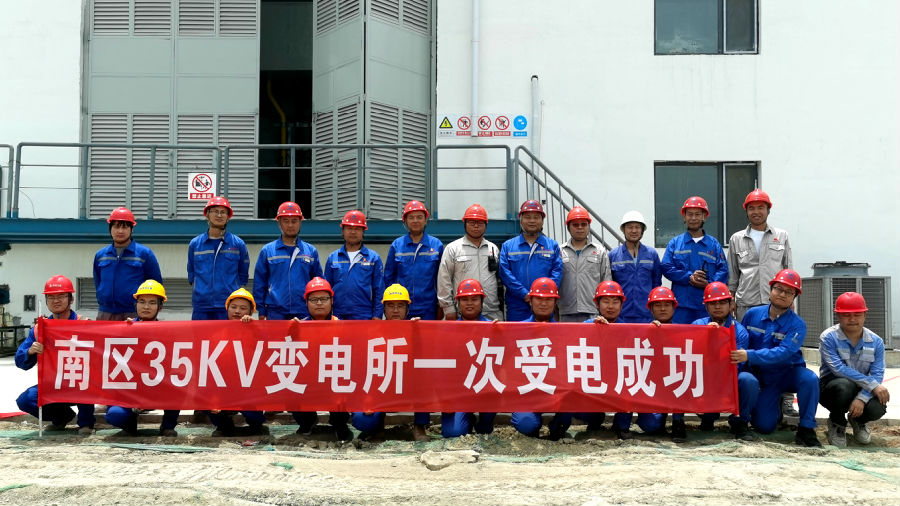 南區(qū)35kV變電所內(nèi)設(shè)35kV和10kV配電裝置、2臺31500kVA 35/10kV主變、6臺2500kVA干式變壓器和低壓配電柜,為南區(qū)所有裝置、輔助設(shè)施及公用工程單元用電設(shè)備供電,其兩回路電源分別來自110kV正泰甲醇變電站及110kV正泰臨白變電站,通過35kV電纜接至變電所內(nèi)35kV開關(guān)柜。建設(shè)期間,項目組精細(xì)化管理,有效控制設(shè)備訂貨、巡檢催交、設(shè)備安裝及調(diào)試等環(huán)節(jié),為本次一次受電成功打下堅實的基礎(chǔ)。