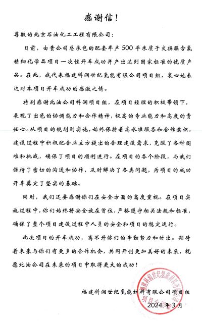 近日,北京石油化工工程有限公司收到福建科潤世紀氫能材料有限公司發(fā)來的感謝信,對我公司在負責(zé)配套年產(chǎn)500平米質(zhì)子交換膜含氟精細化學(xué)品項目期間,出色的協(xié)調(diào)能力和合作精神,極高的專業(yè)能力和高度的責(zé)任心給予了高度評價。