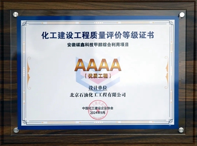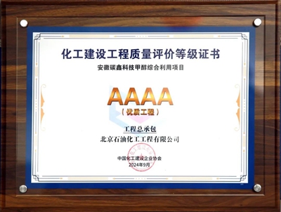 近日,由北京石油化工工程有限公司(簡稱:北油工程)總承包的安徽碳鑫科技甲醇綜合利用項目乙醇聯(lián)合裝置,獲得2024年度,中國化工建設(shè)企業(yè)協(xié)會組織評選的化工建設(shè)工程質(zhì)量總承包優(yōu)質(zhì)工程和設(shè)計單位優(yōu)質(zhì)工程。