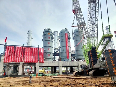 此次吊裝的3臺反應器包括1臺乙酸甲酯加氫反應器和2臺羰基化反應器,均為乙醇裝置的核心設(shè)備。其中,羰基化反應器直徑達5.4米,高度近21米,設(shè)備質(zhì)量604噸,是本項目最重且吊裝難度最大的設(shè)備。