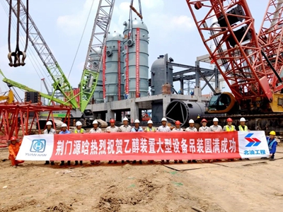 5月28日上午,北京石油化工工程有限公司總承包的荊門源晗電池材料有限公司20萬噸/年乙醇裝置(含電子級乙醇)項目取得重要進展,羰基化加氫單元3臺反應器全部吊裝就位,標志著項目大件設(shè)備吊裝工作進入全面收尾階段。