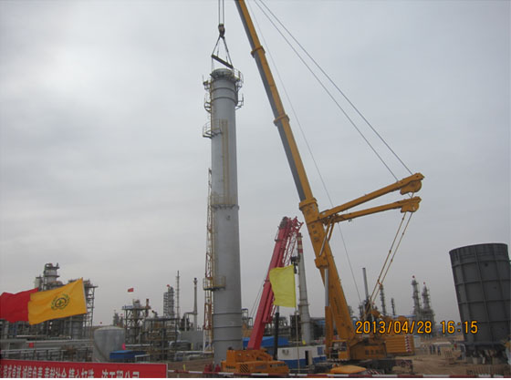 2013年4月28日早晨,隨著吊車發(fā)動機(jī)隆隆的聲響,100項(xiàng)目(煤-油共煉試驗(yàn)示范項(xiàng)目)現(xiàn)場第一吊--煙囪吊裝開始作業(yè),這標(biāo)志著100項(xiàng)目進(jìn)入了設(shè)備安裝階段。