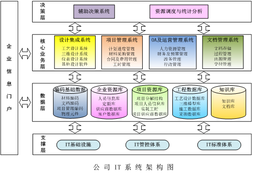 公司建立起以設(shè)計(jì)集成系統(tǒng)、項(xiàng)目管理系統(tǒng)、OA及運(yùn)營(yíng)管理系統(tǒng)、全面預(yù)算系統(tǒng)和文檔管理系統(tǒng)為主體的核心業(yè)務(wù)層系統(tǒng),對(duì)工程設(shè)計(jì)、工程項(xiàng)目管理、公司運(yùn)營(yíng)管理的日常工作起到支撐作用。